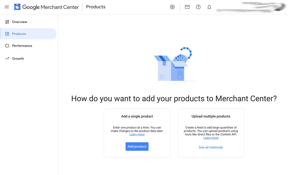 1. Επισκεφτείτε το Google Merchant Center σας και κάντε κλικ στην επιλογή "Products" αριστερά από τον πίνακα διαχείρισης.