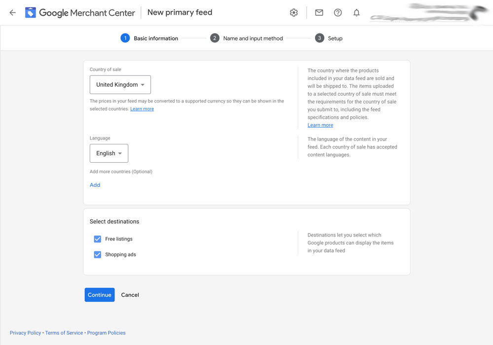 3. Στην επόμενη σελίδα επιλέξτε την κύρια χώρα πώλησης, τη γλώσσα και τους προορισμούς. Συνήθως οι έμποροι ενεργοποιούν και τις δύο επιλογές (Free listings & Shopping ads). Τα Shopping Ads είναι ένας τύπος διαφήμισης της Google που σας επιτρέπει να προβάλλετε δυναμικές διαφημίσεις στο Google Ad Words.