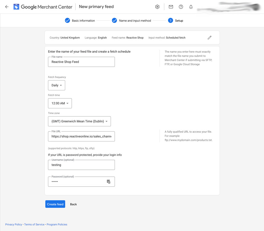 Μόλις τελειώσετε και όλες οι ρυθμίσεις σας έχουν επαληθευτεί, κάντε κλικ στο κουμπί "Create feed".