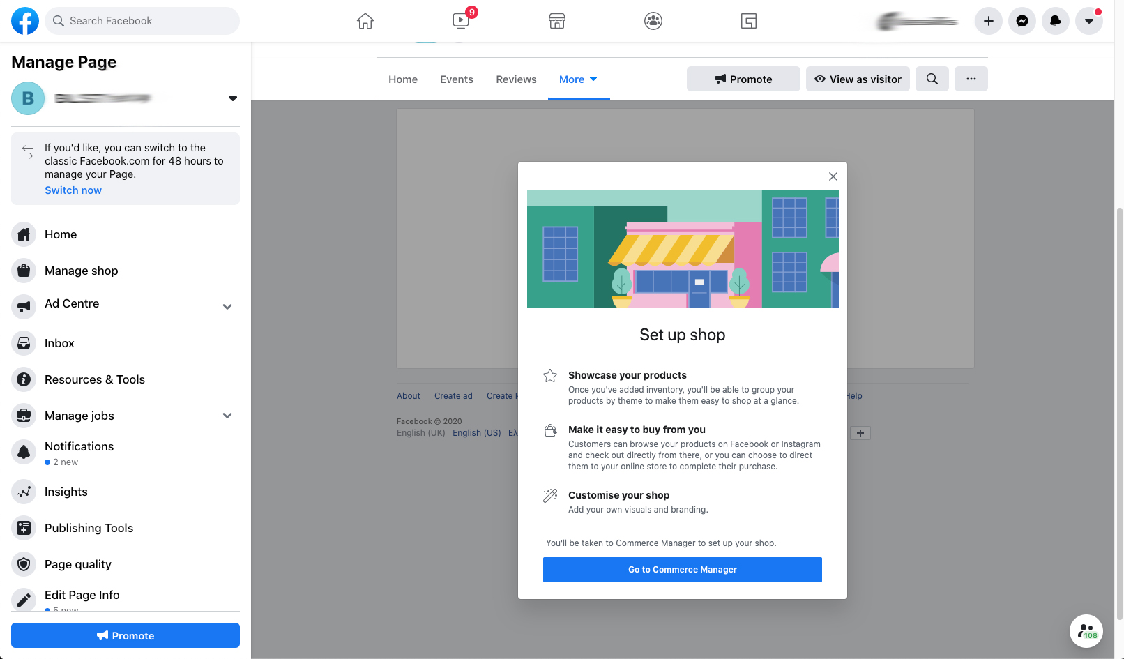 1. Μόλις επισκεφθείτε τη σελίδα σας, επιλέξτε το σύνδεσμο "Manage Shop" από τον πίνακα διαχείρισης αριστερά και κάντε κλικ στον σύνδεσμο "Go to commerce manager".