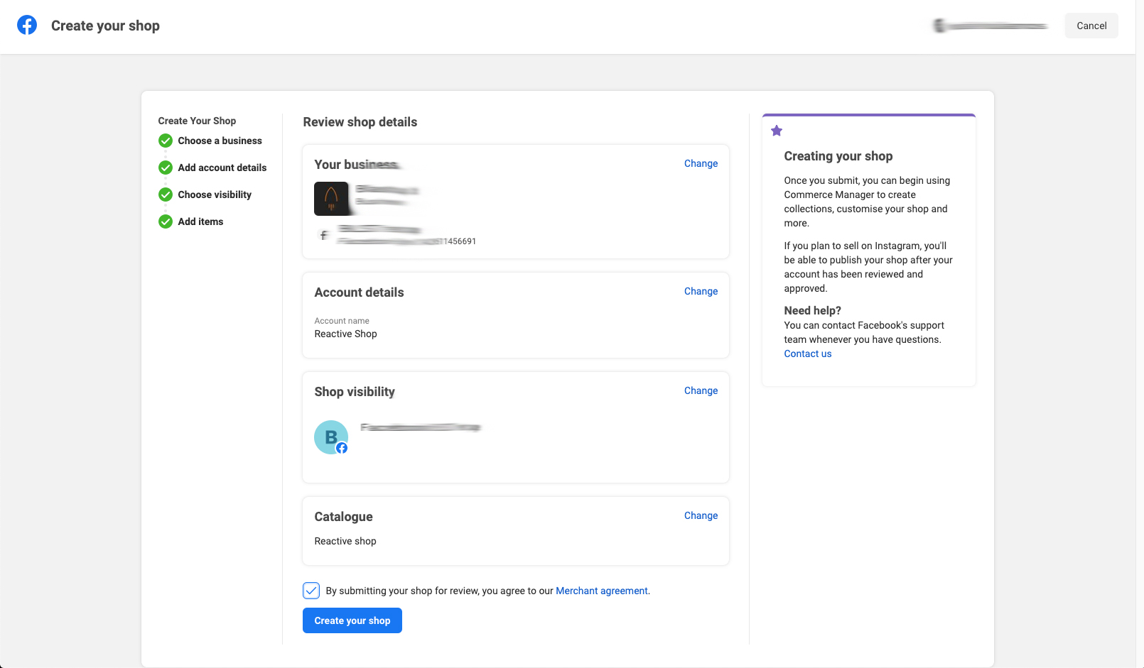 6. Ελέγξτε τις ρυθμίσεις σας, τσεκάρετε το πλαίσιο για να αποδεχτείτε τους όρους και τους κανονισμούς εμπορίου του Facebook και κάντε κλικ στο κουμπί "Create your shop".
