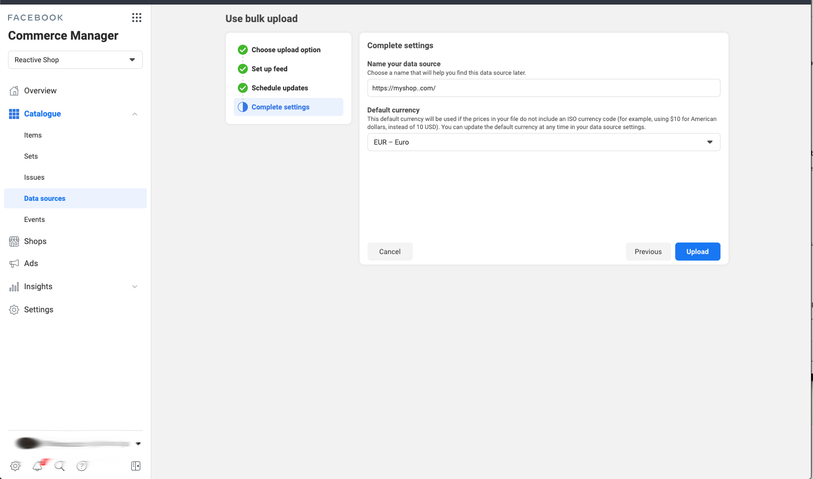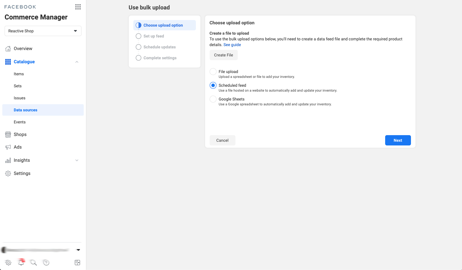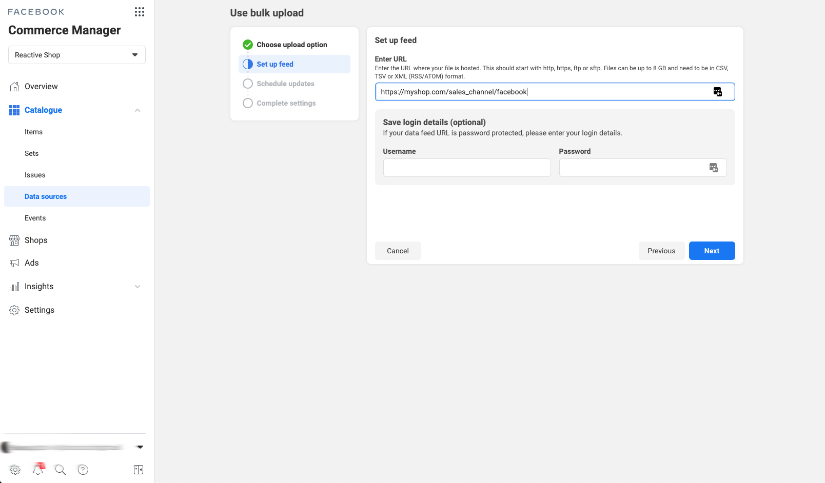 10. Στο επόμενο βήμα, προσθέστε τη διεύθυνση του αρχείου XML. Μπορείτε να βρείτε το link του αρχείου XML από την ενότητα Κανάλια πωλήσεων (Ρυθμίσεις > Κανάλια πωλήσεων) στον πίνακα διαχείρισης του ηλεκτρονικού σας καταστήματος. Μπορείτε επίσης να ορίσετε το όνομα χρήστη και τον κωδικό πρόσβασης, ώστε το Facebook να έχει πρόσβαση στο XML σας μέσω του συστήματος ελέγχου ταυτότητας. Αφού ολοκληρώσετε κάντε κλικ στο επόμενο.