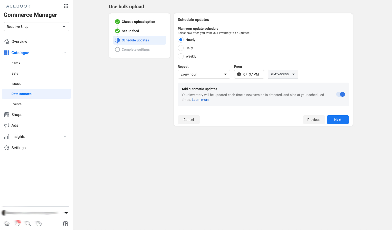11. Από αυτό το βήμα, μπορείτε να προγραμματίσετε τις ενημερώσεις σας στο Facebook. Το Facebook σας επιτρέπει να ορίζετε ωριαίες, καθημερινές και εβδομαδιαίες ενημερώσεις του αρχείου XML. Σας συνιστούμε να ορίσετε να λαμβάνετε ενημερώσεις κάθε ώρα, έτσι ώστε τα προϊόντα σας να είναι πάντα συγχρονισμένα. Ενεργοποιήστε την επιλογή Add automatic updates.